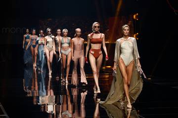En consecuencia, a bien podríamos destacar distintas de las piezas presentadas por Pomeline o Sanjuan, referentes de los acabados metalizados de esta edición; o las diferentes “obras de arte” que supo a bien construir Pedro Palmas, para Palmas Swimwear, tal y como ya hemos venido descubriendo desde FashionUnited con nuestra crónica sobre la entrega de los premios de esta edición, y desde nuestra posterior entrevista, ya publicada, junto al diseñador y ganador del premio a la “Mejor Colección Sostenible” de esta edición de 2023 de GCSW by MC. Siendo así el que, para con lo que respecto a esta tendencia, nos terminamos decantando por destacar el trikini-joya de estética “boho” recubierto de lentejuelas plateadas de Diazar Atelier, desde donde presentaron una de las colecciones más brillantes y completas de esta edición; al igual que lo hicieron desde la firma mallorquina Monnur, de cuyas exquisitas piezas de baño destacamos este “bikini imposible” con capa en tonalidades azul-océano. Terminando ya con un igualmente preciosista bikini, en este caso firmado por la firma italiana Pin-Up Stars, que como una piedra preciosa que resplandece en bruto antes de ser tallada, se nos descubre como una suerte de estratificaciones de tonalidades cobrizas recubiertas por un velo unificador dorado.
