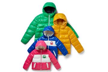 El modelo de hombre se caracteriza por su estampado, mientras que el modelo para mujer destaca por cómo desciende elegantemente hasta las caderas. En la colección de niños, la chaqueta se presenta en colores brillantes y detalles que recuerdan la historia de la marca Benetton.