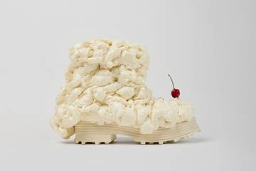 Fijando ya toda nuestra atención sobre cada uno de los diseños que integran esta cápsula artística “Traktori x Friends” de Camper, y sobre las manos de quienes se han encargado de modelarlos e idearlos, de esta iniciativa han formado parte la compañía austríaca especializada en cristales tallados Swarovski; la cantante irlandesa Roisin Murphy; la fotógrafa y creativa multidisciplinar sudafricana Lea Colombo; la firma de moda suiza Ottolinger, formada por la pareja de creativos Christa Bösch y Cosima Gadient; la exmodelo, diseñadora y estilista de revistas de moda haitiana-estadounidense, asentada en Alemania, Michelle Ellie; la artista, y musa berlinesa de Camper, Ivana Vladislava; la periodista finlandesa Maria Veitola; y la estilista y diseñadora de vestuario estadounidense Shirley Kurata, nominada a un premio Óscar por su trabajo en la película independiente “Everything Everywhere All at Once” (2022). Una implicación la de Kurata en esta iniciativa, que ha terminado dando paso a uno de los diseños más deliciosos, y surrealistas, de todos y cuantos la integran, con un diseño de bota Traktori reconstruido y modelado en forma de una montaña de nata montada, con guinda incluida.
