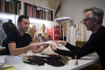 En el pequeño taller parisino de este joven diseñador de alta costura, las posibilidades de la pluma, fina, ligera, pero resistente como un cabello, parecen declinarse al infinito. Las más bellas, como Heidi Klum, Laetitia Casta y los "ángeles" de Victoria's Secret, han llamado a su puerta. En el último desfile de la famosa marca de lencería, la modelo Karlie Kloss lució una deslumbrante capa de plumas decoradas con pan de oro. Está "valorada en 100.000 euros", explica sin disimular su orgullo el que fuera diseñador de Jean Paul Gaultier.