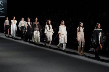 Cómo es el caso de Studio Cumbre —su directora creativa, Micaela Clubourg, fue semifinalista del premio internacional Redress Design— que ha presentado sobre la pasarela una propuesta con una paleta de tonos neutros y siluetas fluidas, que desafían las convenciones del tallaje al priorizar la inclusión y la adaptabilidad. La combinación de texturas –desde transparencias delicadas hasta tejidos gruesos y estructurados– resalta el equilibrio entre lo artesanal y lo contemporáneo.
