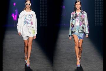 Los imprescindibles vuelven a ser los vestidos cortos y muy ceñidos, realizados con materiales experimentales en colores neón o transparentes, en neopreno, nylon y lentejuelas con brillos nacarados. El glam se mezcla sudaderas deportivas con mensajes como “Wake up world”, “Beauty of truth”,” Born fearless” o “Life storm”, en colores vibrantes, bordados y patch.