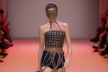 La pasarela con la que debutó la egresada de la Universidad Anáhuac comenzó con una modelo con el rostro cubierto con una máscara, con lo que sentó la base de su mensaje.