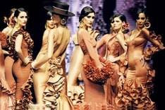 Sobre la pasarela se han podido ver las tendencias que la mujer flamenca lucirá en la Feria de Abril de Sevilla. Este año, los vestidos en tonalidades nude o pastel se hacen más escotados y se convierten en superposiciones entalladas, ceñidas, con volumen en las faldas, adornos de volantes y mangas largas en tela de encaje.